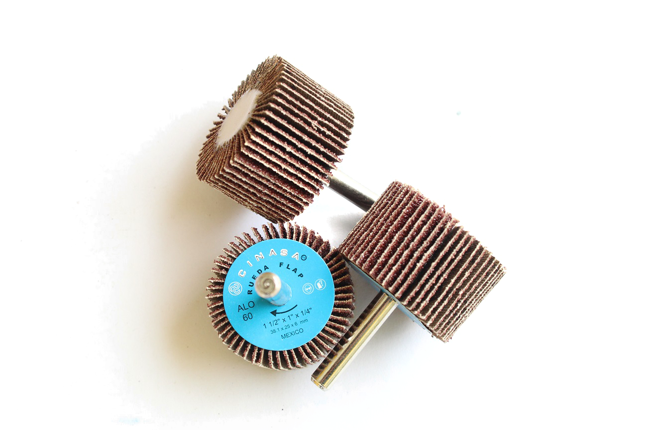 Las ruedas flap con vástago se usan para limpieza y acabado de pequeñas superficies y áreas de difícil acceso. Las ruedas flap con brida metálica para uso en esmeril de banco se usa para operaciones de limpieza y rebabeo dando acabados medios y finos.